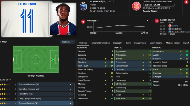 Kalimuendo is more creative though, and aggressive, so the Pressing Forward role, being a little deeper than an Advanced Forward, should suit him well.