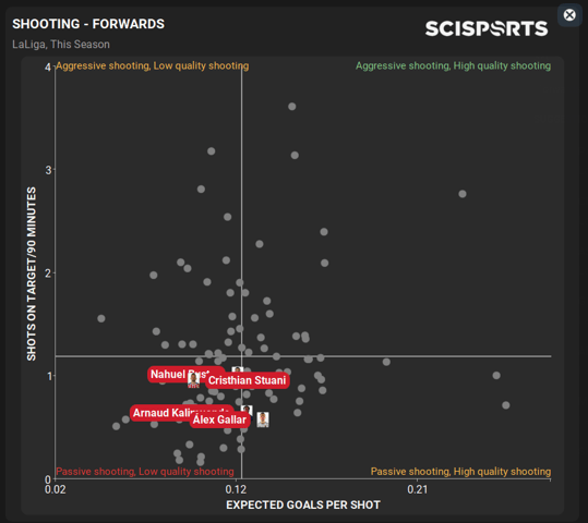 We have glimmers of hope here. Although all our strikers are taking less shots than average, it’s nice to see that Bustos and Kalimuendo are both hitting the average line for xG per shot – and Gallar, who has just returned from a lengthy injury is quite a bit above the average. So, I think if we can get them good chances we should see some the ball hitting the back of the net more often!