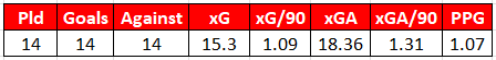 In the first 11 games of this period we weren’t too bad defensively, averaging just 1.17 xGA per game, however the last 3 games weren’t as good with Bilbao putting up 2.22 xG and Valencia getting 2.28 xG, with us being slightly better against Rayo Vallecano (1.07).