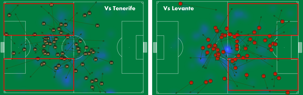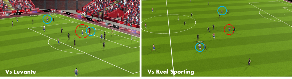 Here we see him circled in red against Levante, moving into a central striker role when Kalimuendo moved out wide – he also got on the end of the following cross and forced a save – and then against Real Sporting where we can see him move up to lead the line when Ganago drops deep.