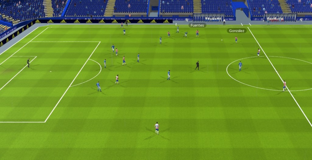 Above you can see that wide centre back in this game, Fuentes, has moved up to overload the right flank, and our Anchor, Gonzalez, has dropped in to cover that RCB position.