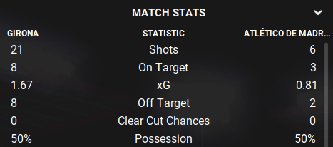 The tough games kept coming as we then faced 3rd placed Atletico Madrid. It was a game which further highlighted our lack of finishing prowess. The game finished 0-0 but look at the stats: