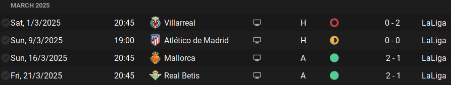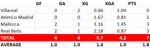 Things improved, however, over the next 2 games as the fixture difficulty eased a little and we pulled off 2-1 victories over relegation-threatened Mallorca and 10th placed Real Betis.